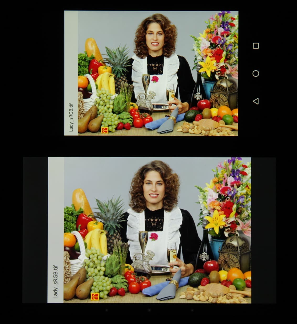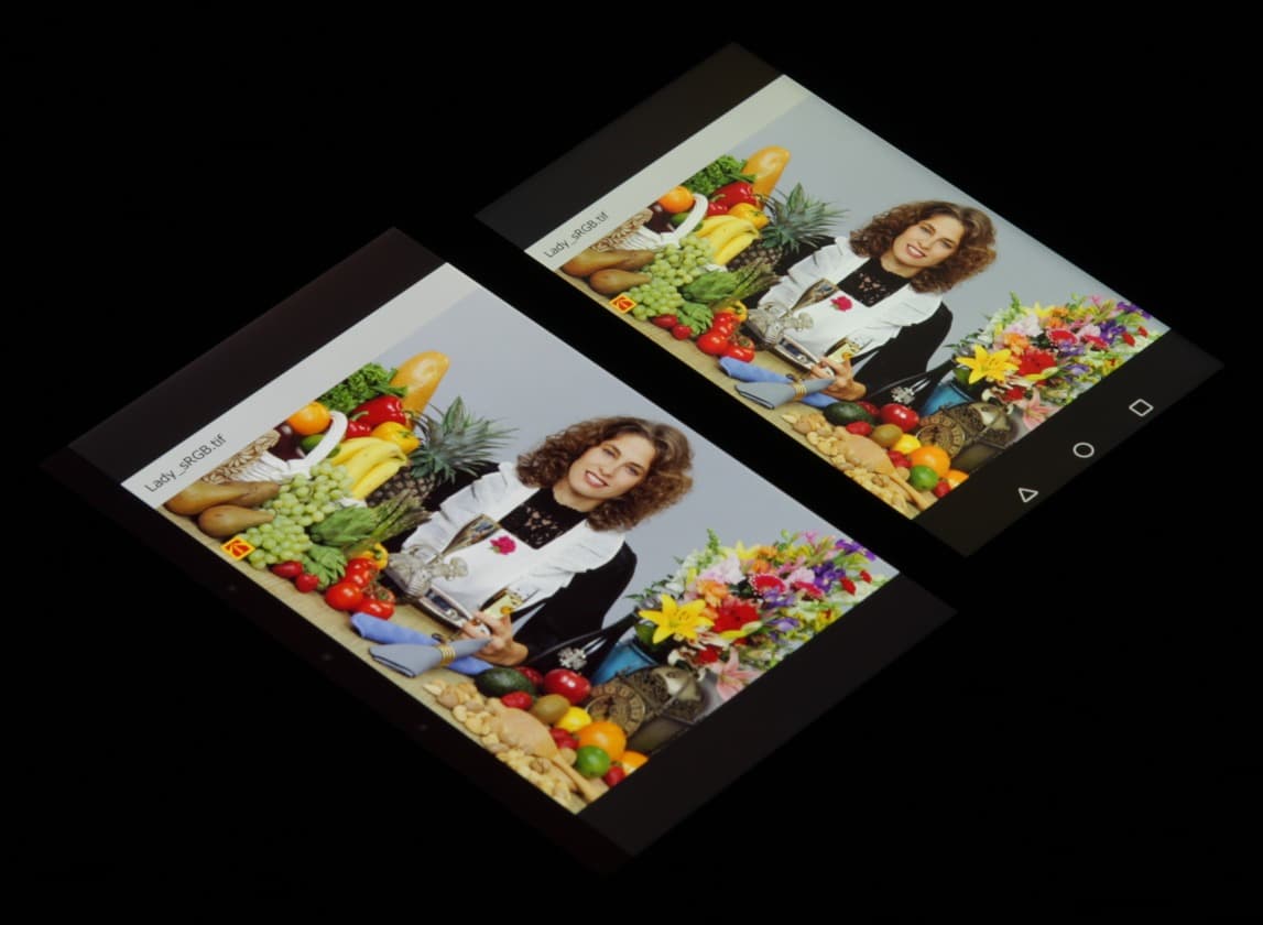Видно, что цвета не сильно изменились у обоих экранов, но у Huawei Ascend Mate 7 контраст уменьшился в большей степени из-за сильного высветления черного. И белое поле:
