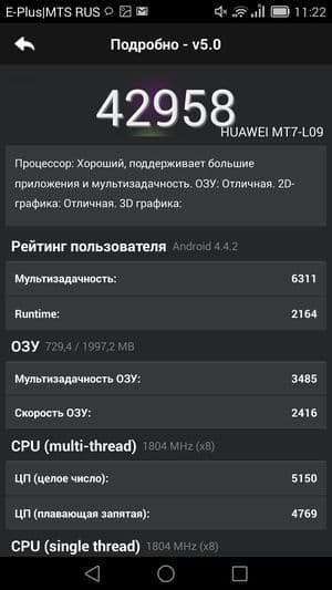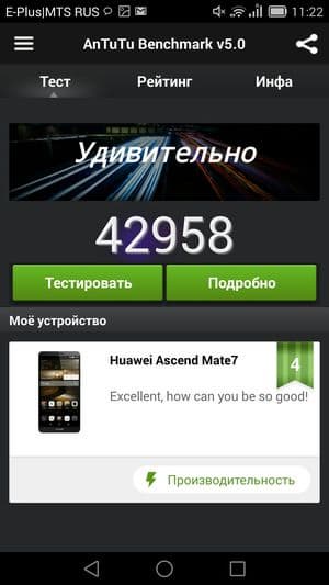Huawei Ascend Mate 7 имеет мощную аккумуляторную батарею, ее емкость составляет целых 4100 мА·ч. Неудивительно, что испытуемый отлично проявил себя во всех наших тестах, справившись со стандартными режимами эксплуатации вполне достойно, хотя рекордов и не продемонстрировал.