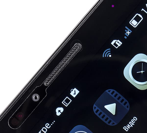 Передняя панель полностью покрыта защитным стеклом Gorilla Glass 3, устойчивым к появлению царапин. В верхней части стекла вырезана щель для решетки разговорного динамика, рядом видны глазки сенсоров и фронтальной камеры. Еще правее врезан светодиодный индикатор уведомлений, светящий неяркой точкой только при выключенном экране. Для отключения индикатора в меню настроек имеется специальный пункт.
