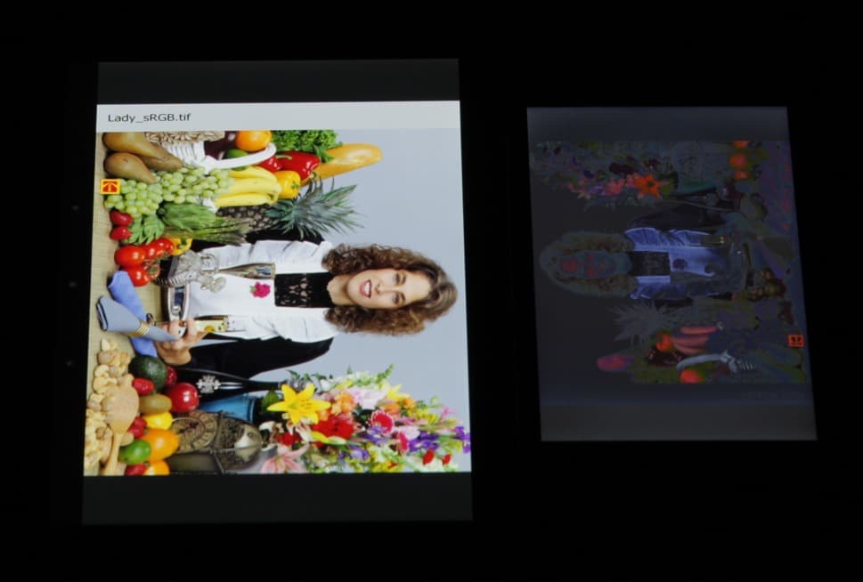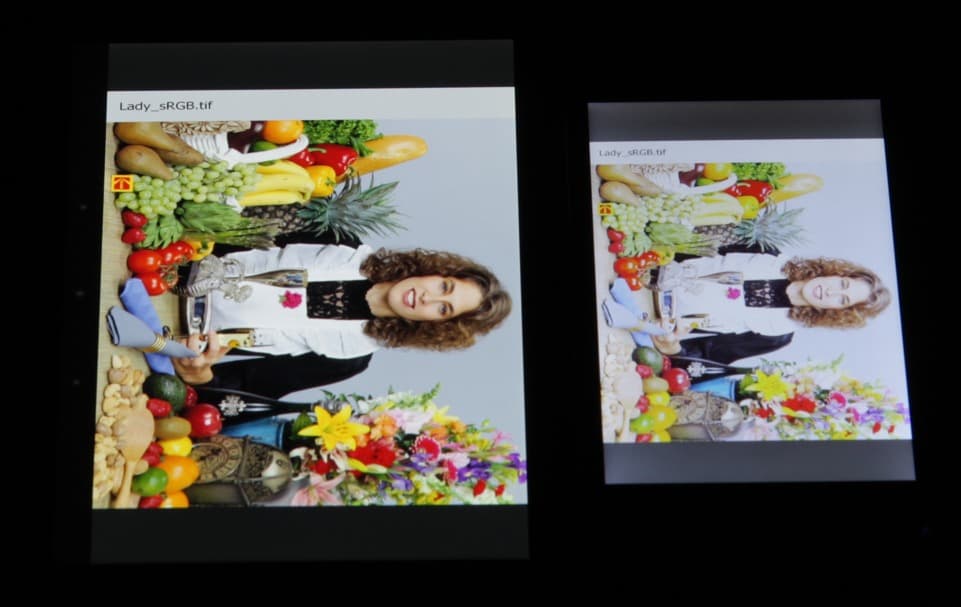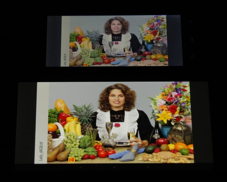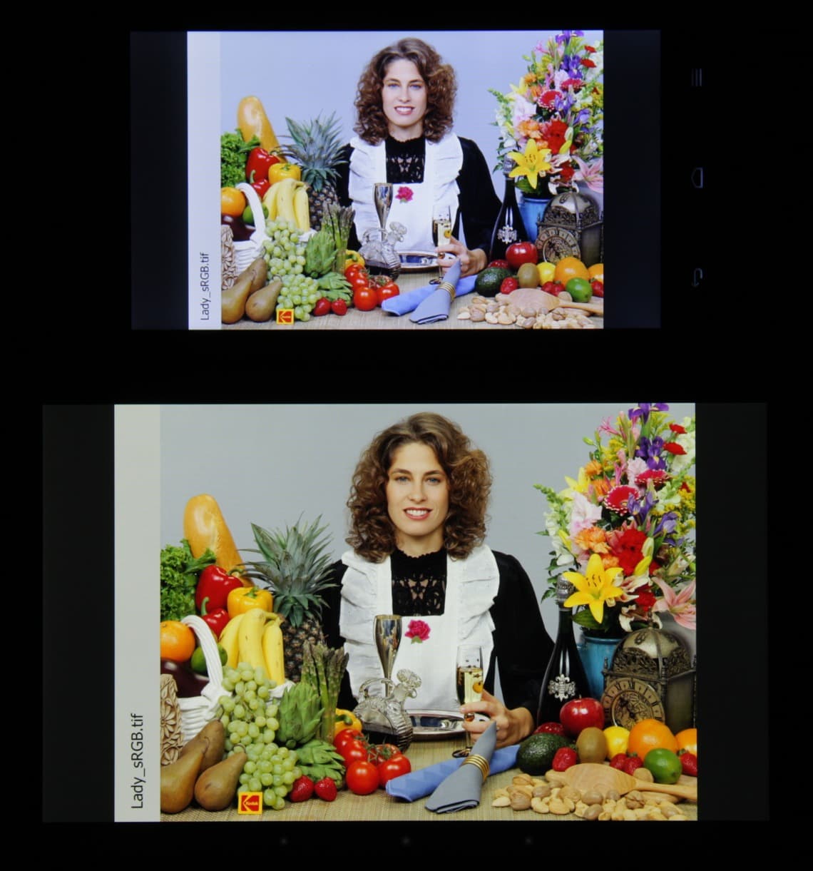 Экран имеет не самые плохие углы обзора в горизонтальном направлении, но при малейшем отклонении вверх инвертируются темные оттенки, при отклонении вниз — светлые. Для сравнения приведем фотографии, на которых на экраны Nexus 7 и тестируемого устройства выведены одинаковые изображения, при этом яркость обоих экранов установлена примерно на 200 кд/м² (при фотографировании цветовой баланс в фотоаппарате принудительно установлен на 6500 К). Перпендикулярно к экранам тестовая картинка: