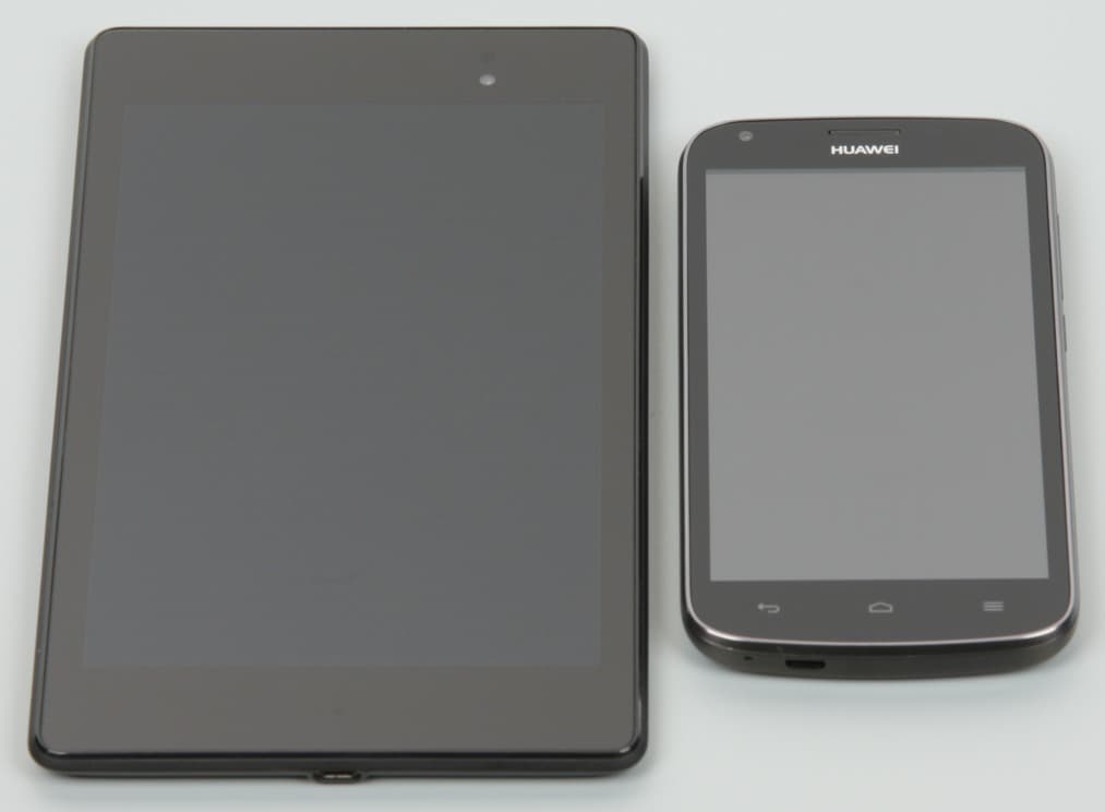 Лицевая поверхность экрана выполнена в виде стеклянной пластины с зеркально-гладкой поверхностью, устойчивой к появлению царапин. Судя по отражению объектов антибликовые свойства экрана хуже, чем у экрана Google Nexus 7 (2013) (далее мы сравниваем именно с ним). Для наглядности приведем фотографию, на которой в выключенных экранах обоих устройств отражается белая поверхность (Huawei Hero 3 легко отличить, так как он меньше):