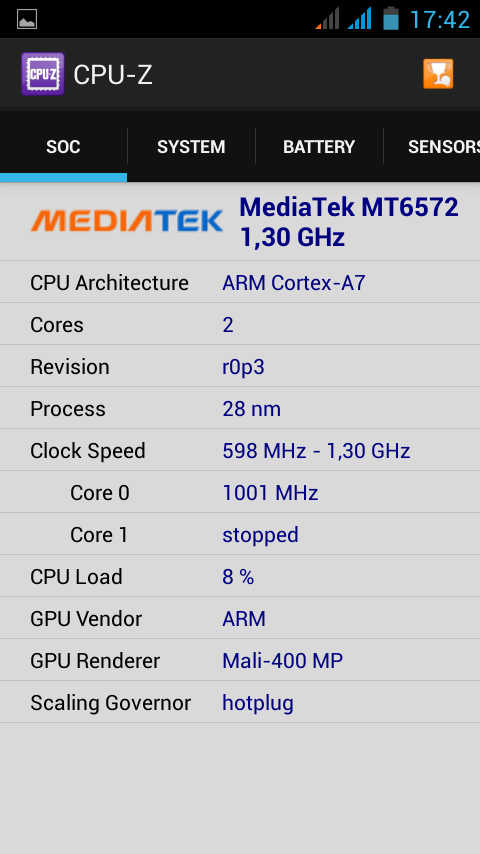 | SoC | MediaTek MT6572 (2 ядра ARM Cortex-A7) @1,3 ГГц | MediaTek MT6582 (4 ядра ARM Cortex-A7) @1,3 ГГц | MediaTek MT6589 (4 ядра ARM Cortex-A7) @1,2 ГГц | MediaTek MT6589 (4 ядра ARM Cortex-A7) @1,2 ГГц | MediaTek MT6589T (4 ядра ARM Cortex-A7) @1,5 ГГц | Qualcomm Snapdragon S4 @1,2 ГГц (2 ядра, ARMv7 Krait) |