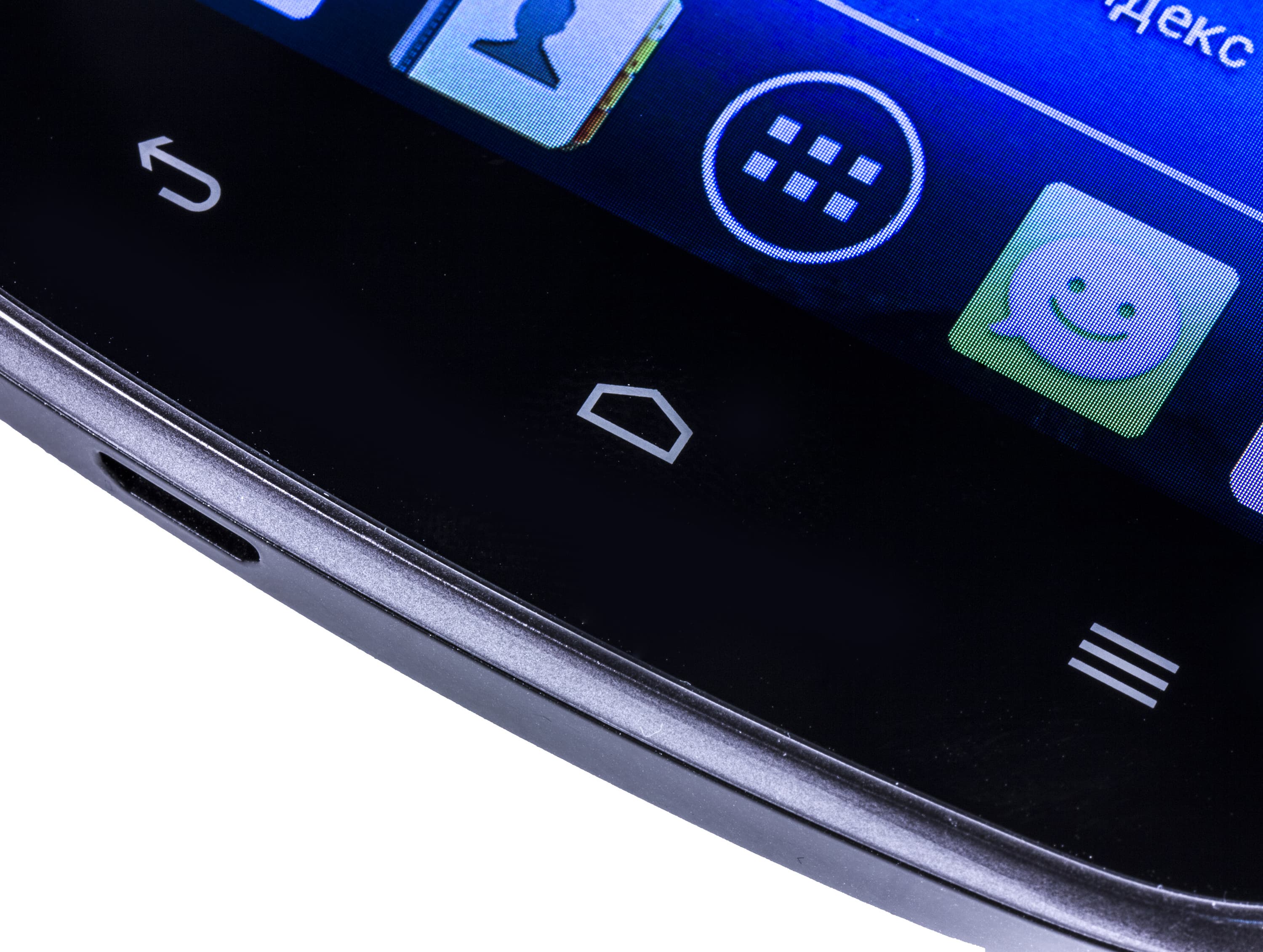 В нижней части лицевой панели Huawei Hero 3 расположены три стандартные сенсорные кнопки: возврат к предыдущему окну программы, на основной экран системы и вызов меню. Подсветки у кнопок нет.