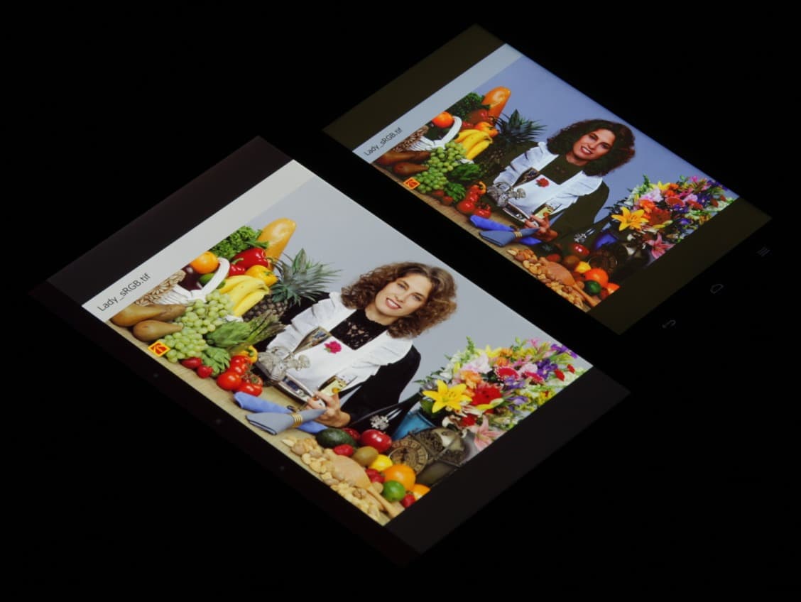 Экран имеет хорошие углы обзора без значительного сдвига цветов даже при больших отклонениях взгляда от перпендикуляра к экрану и без инвертирования (корме самых-самых темных при отклонении взгляда вправо) оттенков. Для сравнения приведем фотографии, на которых на экраны Huawei Honor 3X и Nexus 7 выведены одинаковые изображения, при этом яркость экранов изначально установлена примерно на 200 кд/м², а цветовой баланс на фотоаппарате принудительно переключен на 6500 К. Перпендикулярно к экранам белое поле: