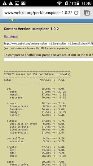 Что касается бенчмарков для оценки скорости движка javascript, то стоит всегда делать скидку на то, что в них результаты существенно зависят от браузера, в котором запускаются, так что сравнение может быть истинно корректным только на одинаковых ОС и браузерах, а такая возможность имеется при тестировании не всегда. В случае с ОС Android мы всегда стараемся использовать Google Chrome.