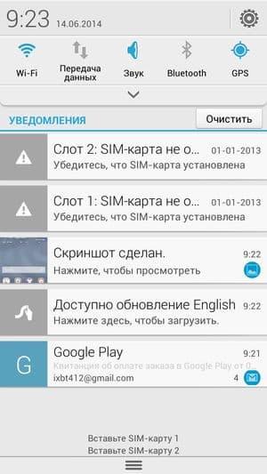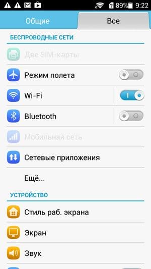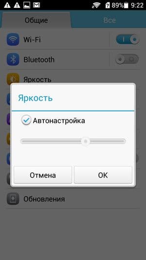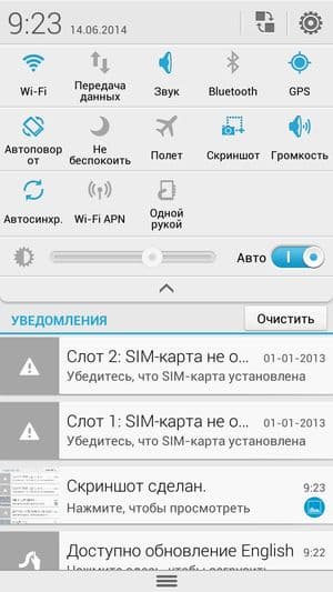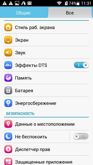 Меню настроек разбито на два раздела, навигация между которыми осуществляется с помощью полоски выбора в верхней части экрана. В разделе «Общие» разработчики собрали все функции, которые, по их мнению, являются наиболее востребованными и часто используемыми, а в другом («Все») — полный стандартный набор всех настроек в том виде, как было задумано разработчиками Google Android. Меню уведомлений раскрывается в два этапа, здесь же можно быстро изменить уровень яркости экрана, что удобно.