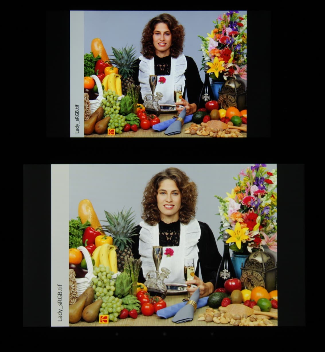 В итоге визуально цвета имеют естественную насыщенность. Баланс оттенков на шкале серого средний, так как цветовая температура заметно выше стандартных 6500 К, а отклонение от спектра абсолютно черного тела (ΔE) на большей части шкалы серого выше 10, что даже для потребительского устройства считается не очень хорошим показателем. И все же при этом цветовая температура и ΔE мало изменяются от оттенка к оттенку — это положительно сказывается на визуальной оценке цветового баланса. (Самые темные области шкалы серого можно не учитывать, так как там баланс цветов не имеет большого значения, да и погрешность измерений цветовых характеристик на низкой яркости большая.)