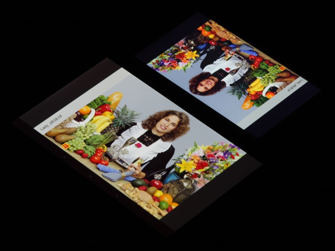 Цветопередача хорошая и цвета насыщенные у обоих экранов, но цветовой баланс немного различается. Теперь под углом примерно 45 градусов к плоскости и к стороне экрана: