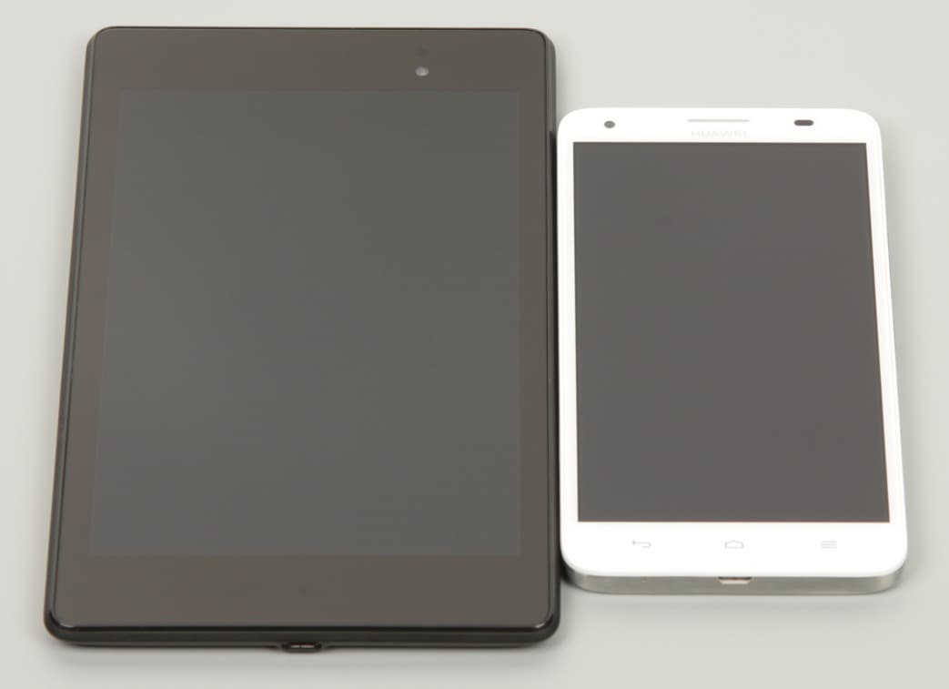 Лицевая поверхность экрана выполнена в виде стеклянной пластины с зеркально-гладкой поверхностью, устойчивой к появлению царапин. Судя по отражению объектов антибликовые свойства экрана не хуже, чем у экрана Google Nexus 7 (2013) (далее просто Nexus 7). Для наглядности приведем фотографию, на которой в выключенных экранах отражается белая поверхность (слева — Nexus 7, справа — Huawei Honor 3X, далее их можно различать по размеру):