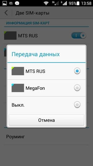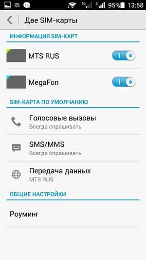 Смартфон поддерживает работу с двумя SIM-картами, и в целом работа с ними в меню организована по знакомому принципу: можно любую из SIM-карт назначить основной для организации голосовых звонков, передачи данных или отправки SMS-сообщений; при наборе номера также можно выбрать желаемую карту в контекстном подменю. С сетями 3G может работать SIM-карта в любом слоте, однако одновременно в этом режиме может функционировать лишь одна из карт. Для смены режима карточки менять местами не требуется — это можно сделать прямо из меню телефона. Работа с двумя SIM-картами организована по привычному стандарту Dual SIM Dual Standby, когда обе карты могут находиться в активном режиме ожидания, но одновременно работать не могут — радиомодуль здесь только один.