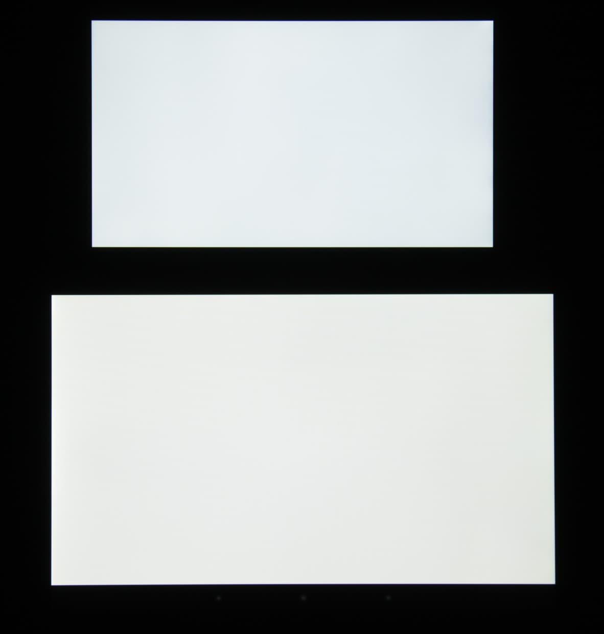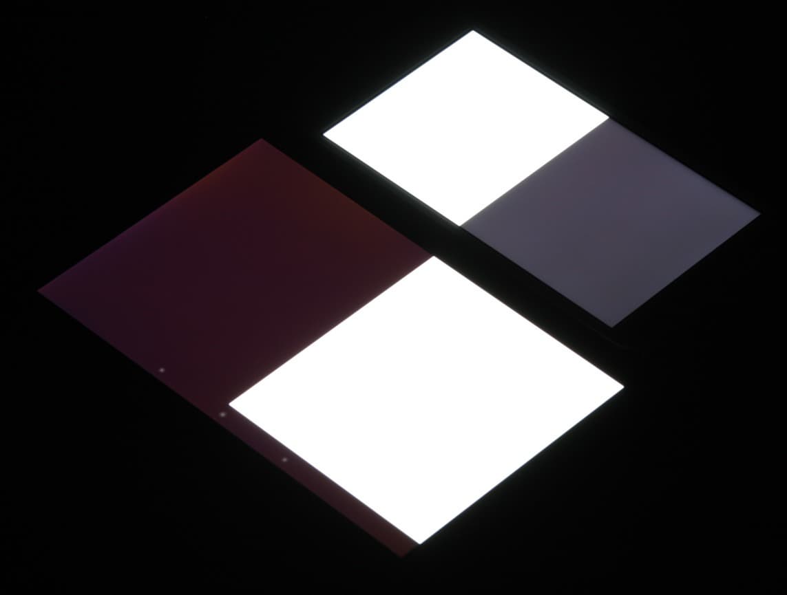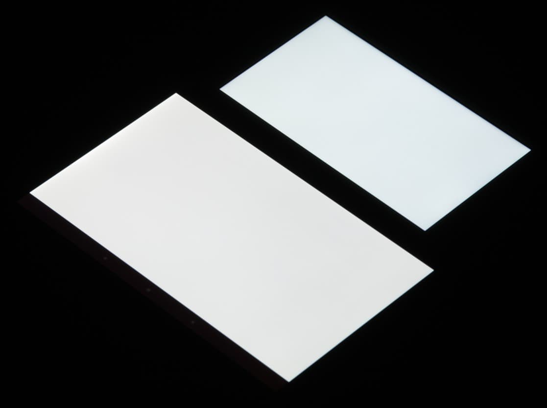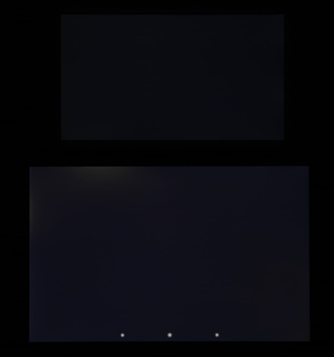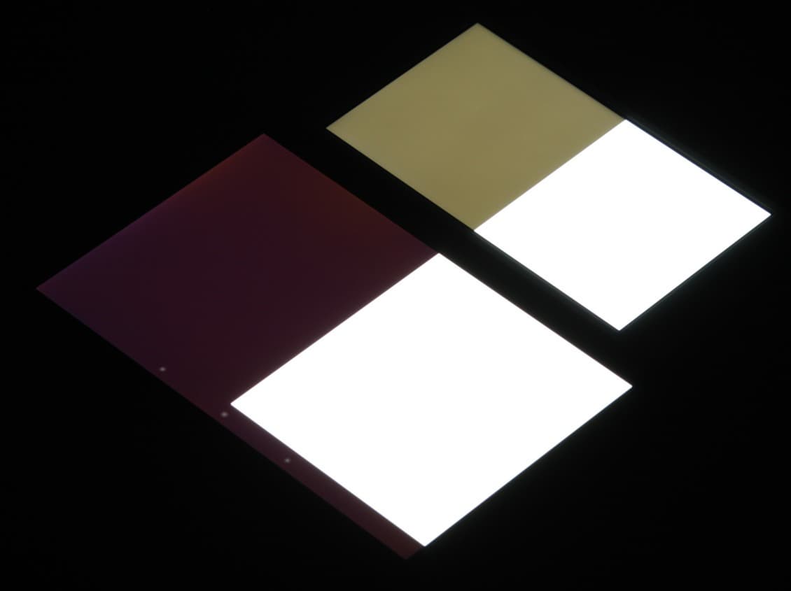 Яркость под углом у экранов уменьшилась (как минимум в 5 раз, исходя из разницы в выдержке), и уменьшилась примерно одинаково. Черное поле при отклонении по диагонали высветляется сильно или средне и приобретает желтоватый или фиолетовый оттенок. Фотографии ниже это демонстрируют (яркость белых участков в перпендикулярном плоскости экранов направлении одинаковая!):