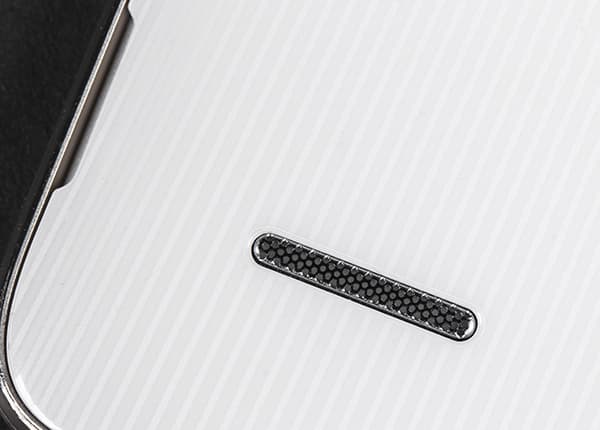Еще ниже прорезана щель для выхода звука из основного динамика, прикрытая хромированной решеточкой. Звук частично перекрывается, когда смартфон лежит на твердой поверхности экраном вверх. Рядом виднеется небольшая прорезь для упора при снятии крышки.