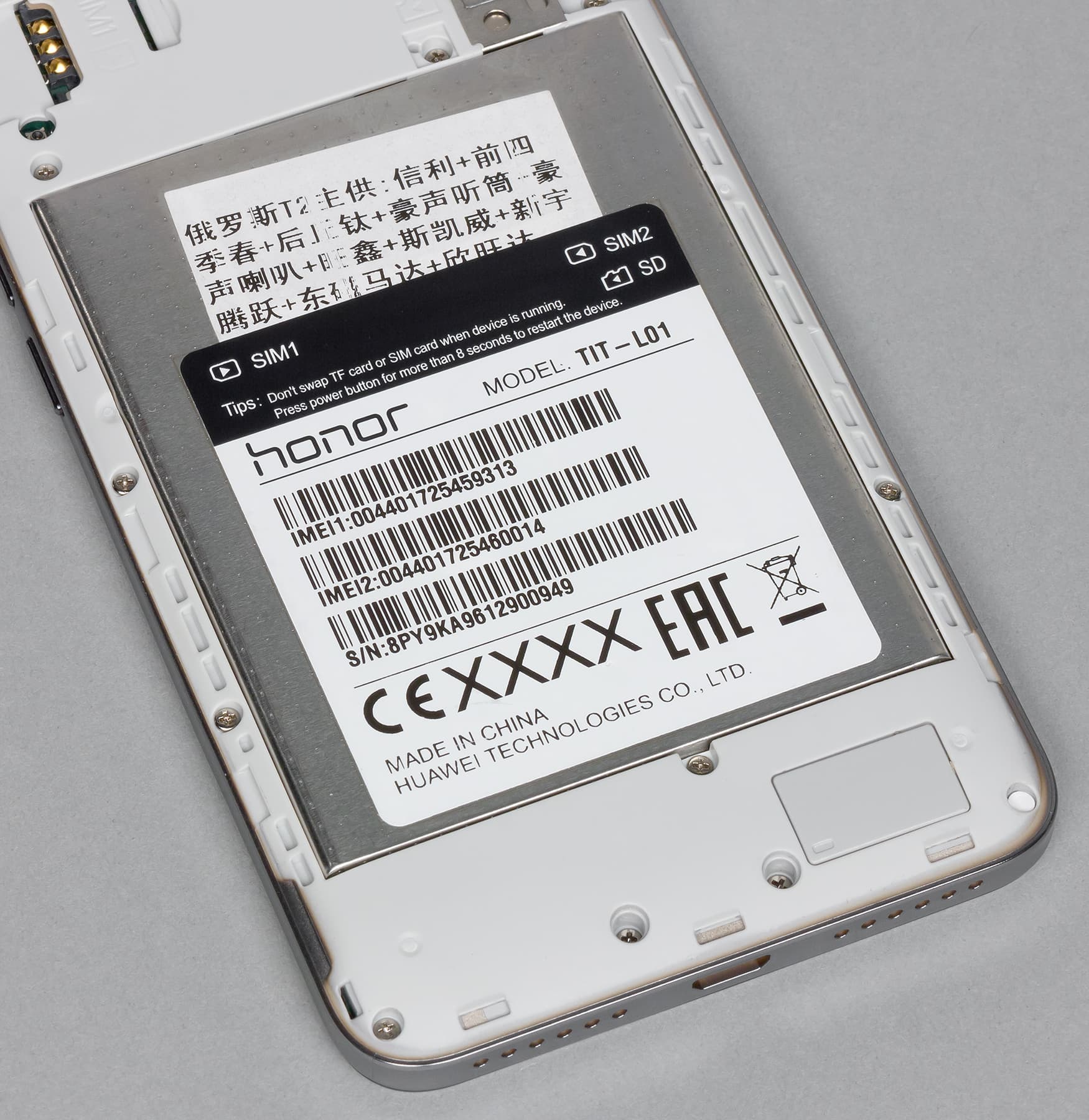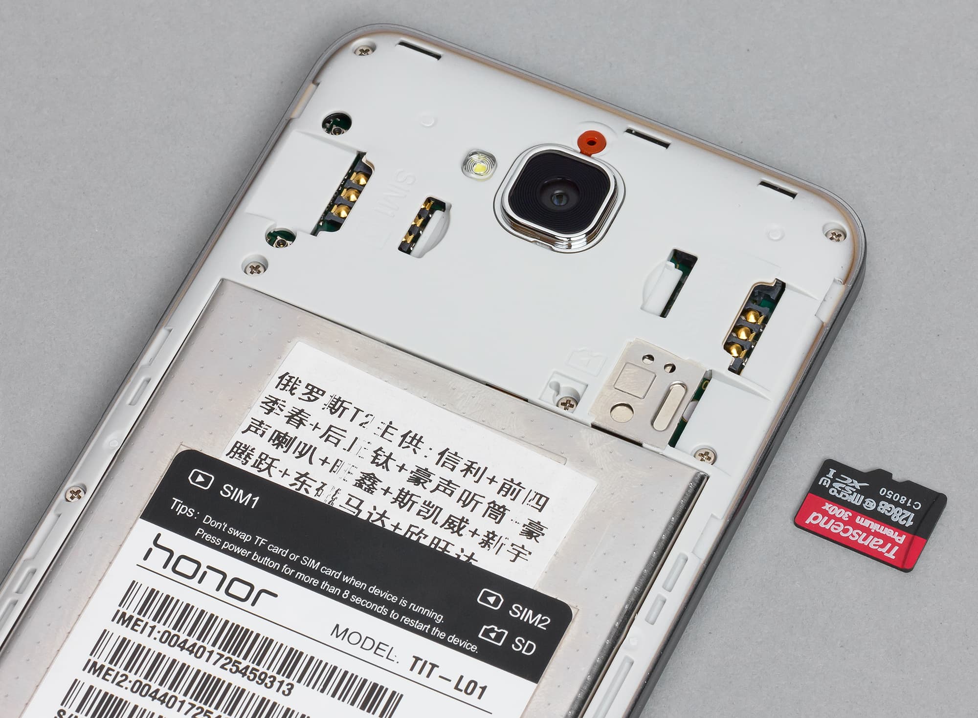 Не смотря на то, что крышка съемная, аккумуляторную батарею самостоятельно заменить не получится — она намертво закрыта металлической пластиной, как и в случае с обычным 4C. Доступ здесь можно получить только к разъемам для карточек, коих здесь имеется целых три штуки. То есть, в данном случае не придется жертвовать одной из SIM-карт, чтобы вставить карту памяти, и это приятно.