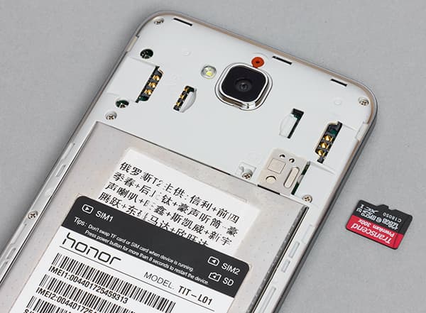 Между решетками разместился универсальный разъем Micro-USB, не только поддерживающий подключение по OTG, но и способный с помощью этого же переходника заряжать любой другой смартфон. Зачем это нужно, не совсем понятно, хотя, если представить Honor 4C Pro в роли второго вспомогательного аппарата, то в принципе все становится логично. Тем более, что новинка получила очень объемную батарею в целых 4000 мА·ч.