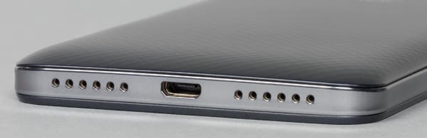 Звуковую решетку вынесли на этот раз в нижний торец, и это хорошо - звук не будет перекрываться поверхностью стола, когда смартфон находится в лежачем положении. Решетки проделано две, но, как водится, только один из ее сегментов пропускает звук динамика, другой служит лишь бутафорией.