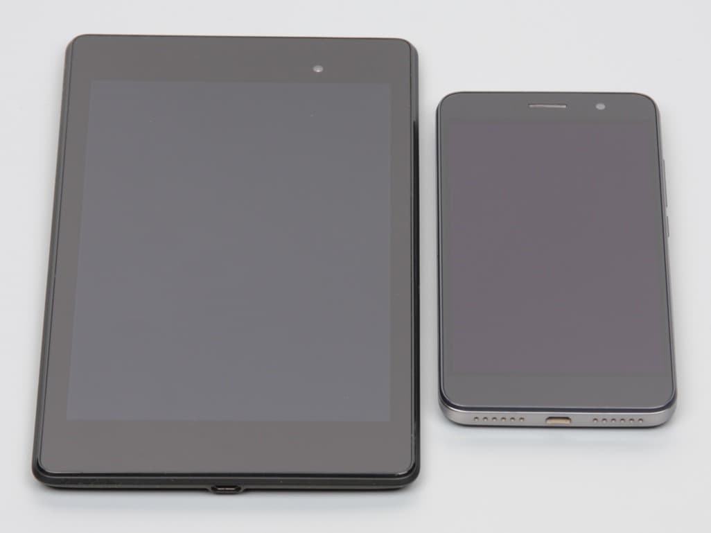 Лицевая поверхность экрана выполнена в виде стеклянной пластины с зеркально-гладкой поверхностью, устойчивой к появлению царапин. Судя по отражению объектов антибликовые свойства экрана может чуть лучше, чем у экрана Google Nexus 7 (2013) (далее просто Nexus 7). Для наглядности приведем фотографию, на которой в выключенных экранах отражается белая поверхность (слева — Nexus 7, справа — Huawei Honor 4C Pro, далее их можно различать по размеру):