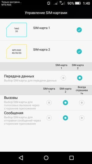 Смартфон поддерживает работу с двумя SIM-картами по стандарту Dual SIM Dual Standby. Радиомодуль здесь один, поэтому активный разговор может быть только один. Хотя Huawei одна из немногих компаний, которая может и два радиомодема установить, но здесь не тот случай. С сетями 3G/4G может работать SIM-карта в любом слоте, однако одновременно в этом режиме может работать лишь одна из карт (вторая будет работать только в 2G). Все настройки, как обычно, удобно объединены на единой странице. Такой продуманный сервис встречается далеко не у каждого производителя, это касается и оригинального интерфейса Android от самой Google. Там все эти настройки раскиданы аж по трем разным разделам, здесь же настраивать работу с двумя картами одно удовольствие.