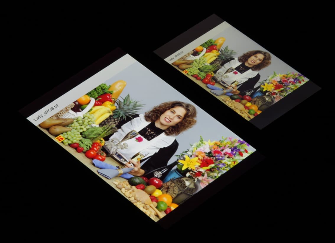 В итоге визуально цвета имеют почти естественную насыщенность (почти — из-за повышения цветового контраста). Баланс оттенков на шкале серого хороший, так как цветовая температура не сильно выше стандартных 6500 К, и отклонение от спектра абсолютно черного тела (ΔE) ниже 10, что для потребительского устройства считается приемлемым показателем. При этом цветовая температура и ΔE мало изменяются от оттенка к оттенку — это положительно сказывается на визуальной оценке цветового баланса. (Самые темные области шкалы серого можно не учитывать, так как там баланс цветов не имеет большого значения, да и погрешность измерений цветовых характеристик на низкой яркости большая.)