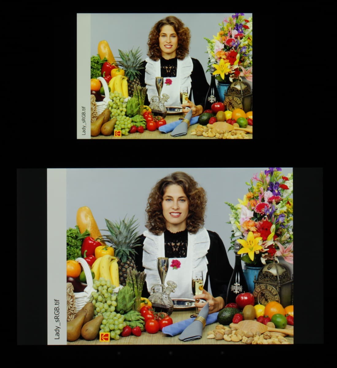В итоге визуально цвета имеют естественную насыщенность. Баланс оттенков на шкале серого неплохой, так как цветовая температура не сильно выше стандартных 6500 К, а отклонение от спектра абсолютно черного тела (ΔE) примерно 10, что для потребительского устройства считается приемлемым показателем. При этом цветовая температура и ΔE мало изменяются от оттенка к оттенку — это положительно сказывается на визуальной оценке цветового баланса. (Самые темные области шкалы серого можно не учитывать, так как там баланс цветов не имеет большого значения, да и погрешность измерений цветовых характеристик на низкой яркости большая.)