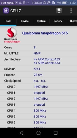 - SoC Qualcomm Snapdragon 615 (MSM8939), 8 ядер ARM Cortex-A53 @1,5 ГГц