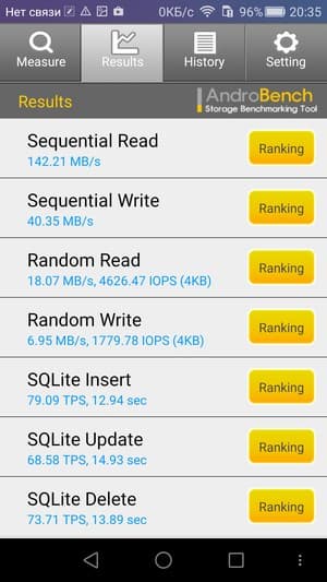 Результаты теста AndroBench на скорость работы с памятью: