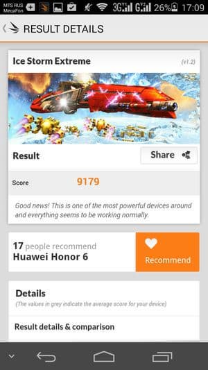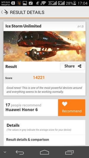 По результатам тестирования аппаратная платформа HiSilicon Kirin 920 собственного производства Huawei показала высочайшие результаты производительности, даже если сравнивать с современными топовыми платформами лидеров рынка. Восьмиядерную платформу MediaTek MT6592 она разбила наголову, вплотную приблизившись к показателям наиболее мощных на сегодняшний день SoC Qualcomm Snapdragon 800/801. Что касается результатов в популярном тесте AnTuTu, то и в нем смартфон демонстрирует очень приличные цифры, но тут стоит учитывать, что теперь мы используем для тестов новую, пятую версию популярного бенчмарка, а все предыдущие модели проходили тестирование в четвертой версии, и пока не совсем пока понятно, как результаты двух версий теста коррелируют друг с другом. Пока мы будем помечать в табличках, какими версиями бенчмарка тестировалась та или иная модель. В любом случае смартфон Huawei Honor 6 достаточно мощный, производительности его аппаратной платформы будет еще долго хватать для выполнения любых поставленных задач.