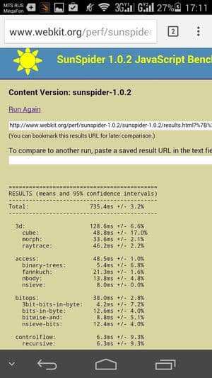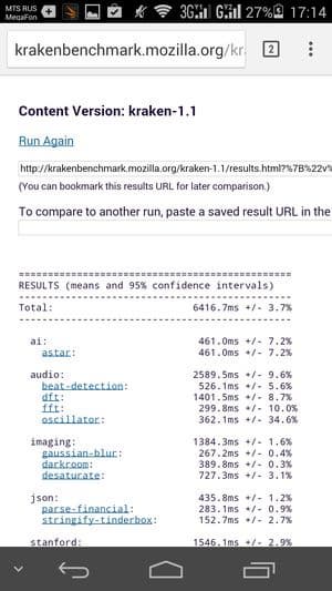 Что касается бенчмарков для оценки скорости движка javascript, то стоит всегда делать скидку на то, что в них результаты существенно зависят от браузера, в котором запускаются, так что сравнение может быть истинно корректным только на одинаковых ОС и браузерах, а такая возможность имеется при тестировании не всегда. В случае с ОС Android мы всегда стараемся использовать Google Chrome.