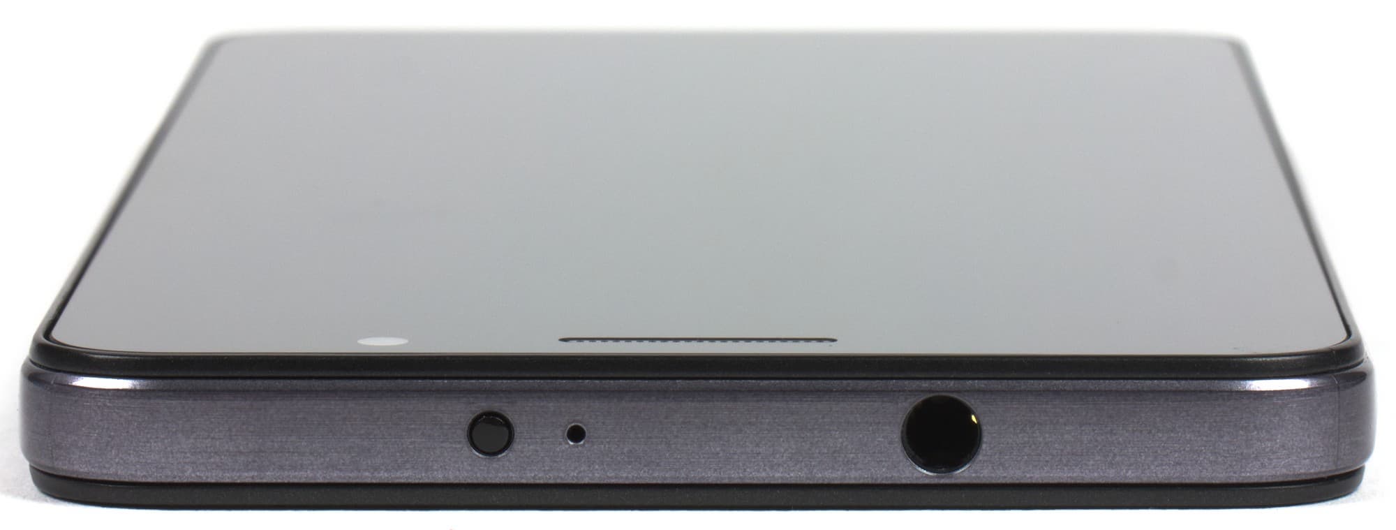 Сверху над экраном в защитное стекло врезана окрашенная в черный цвет решетка динамика, рядом виднеются глазки фронтальной камеры и сенсоров. Здесь же рядом расположен такой полезный элемент, как светодиодный индикатор — он оповещает различными цветами о статусе зарядки и входящих событиях.