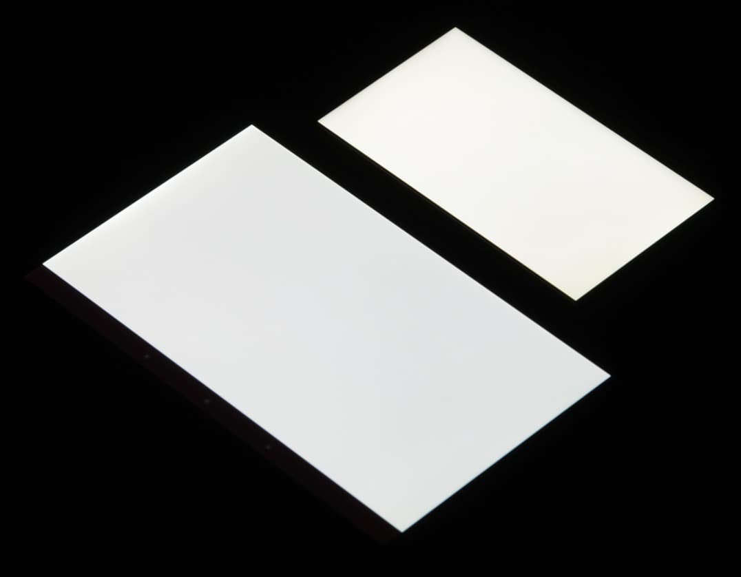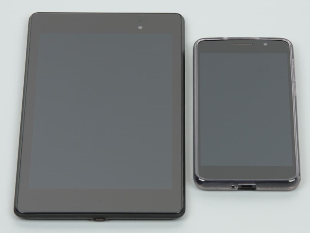 Лицевая поверхность экрана выполнена в виде стеклянной пластины с зеркально-гладкой поверхностью, устойчивой к появлению царапин. Судя по отражению объектов антибликовые свойства экрана не хуже, чем у экрана Google Nexus 7 (2013) (далее просто Nexus 7). Для наглядности приведем фотографию, на которой в выключенных экранах отражается белая поверхность (слева — Nexus 7, справа — Huawei Honor 6, далее их можно различать по размеру):