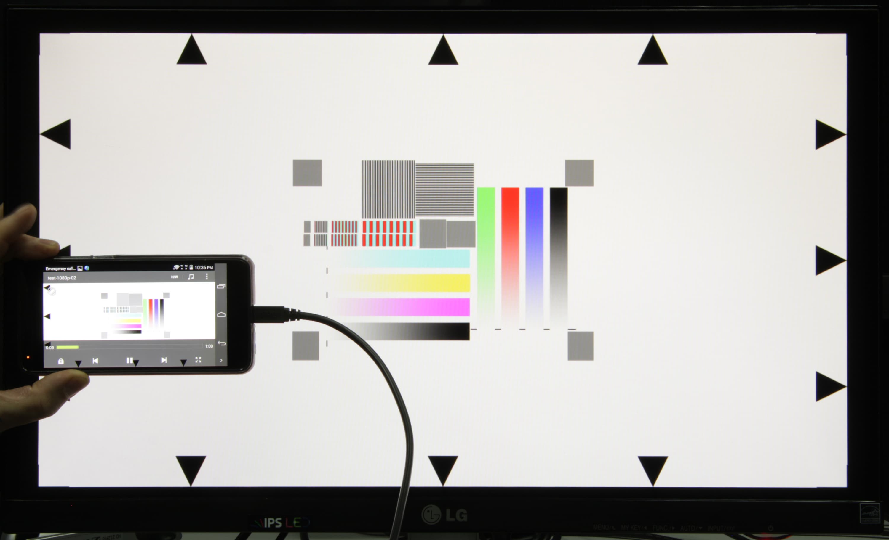 Далее с помощью набора тестовых файлов с перемещающимися на одно деление за кадр стрелкой и прямоугольником (см. «Методика тестирования устройств воспроизведения и отображения видеосигнала. Версия 1 (для мобильных устройств)») мы проверили, как видео выводится на экран тестируемого устройства. Снимки экрана с выдержкой в 1 с помогли определить характер вывода кадров видеофайлов с различными параметрами: варьировались разрешение 1280 на 720 (720p) и 1920 на 1080 (1080p) пикселей и частота кадров 24, 25, 30, 50 и 60 кадр/с. В тестах мы использовали видеоплеер MX Player в режиме «Аппаратный». Результаты этого (блок, озаглавленный как «Экран смартфона») и следующего теста сведены в таблицу: