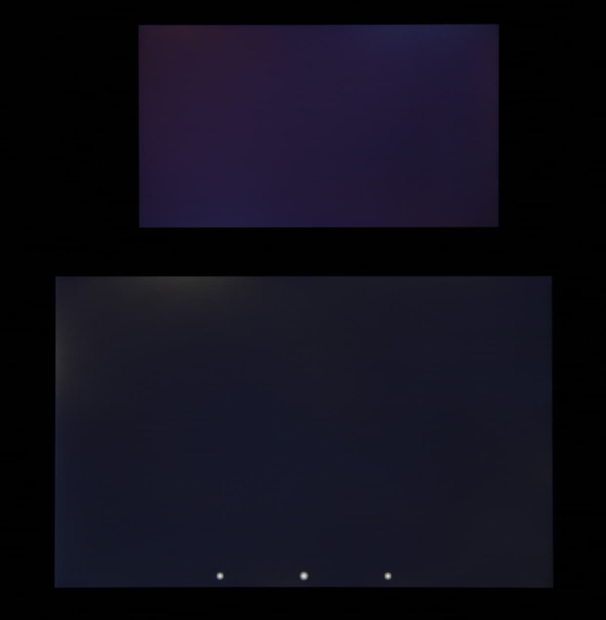 Яркость под углом у экранов уменьшилась (как минимум в 5 раз, исходя из разницы в выдержке), но у Huawei Honor 6 экран все светлее (яркость по фотографиям 243 против 228 у Nexus 7). Черное поле при отклонении по диагонали высветляется очень сильно и приобретает желтоватый, фиолетовый или красно-фиолетовый оттенок. Фотографии ниже это демонстрируют (яркость белых участков в перпендикулярном плоскости экранов направлении одинаковая!):