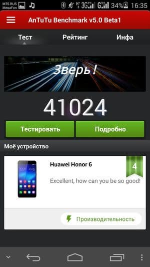| Huawei Honor 6 | 3100 мА·ч | 16 ч. 40 м. | 9 ч. 30 м. | 4 ч. 50 м. |