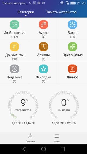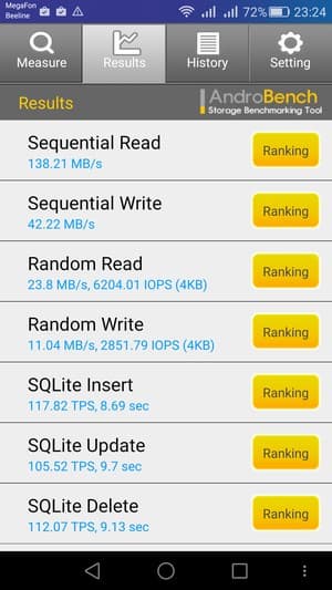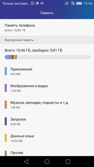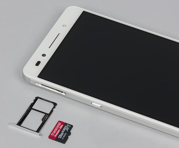 Объем оперативной памяти смартфона составляет 3 ГБ, из них изначально свободно чуть более 2 ГБ. В аппарате установлено 16 ГБ собственной памяти, из них изначально пользователю доступно для его собственных нужд 9,85 ГБ. Объем встроенной памяти можно увеличить за счет карт microSD, поддерживаются карточки объемом до 128 ГБ. На практике наша проверочная карта Transcend Premium microSDXC UHS-1 объемом 128 ГБ уверенно распозналась устройством. Также есть возможность подключения к порту Micro-USB внешних устройств в режиме USB OTG.