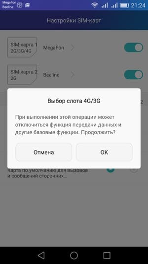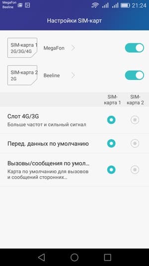 Любую из SIM-карт можно назначить основной для организации голосовых звонков, передачи данных и отправки SMS-сообщений; при наборе номера также можно выбрать желаемую карту соответствующими кнопками. С сетями 3G/4G может работать SIM-карта в любом слоте, но одновременно в этом режиме может функционировать лишь одна из них. Для смены назначений слотов карточки менять местами не требуется — это можно сделать прямо из меню телефона. Работа с двумя SIM-картами организована по стандарту Dual SIM Dual Active, когда обе карты могут работать параллельно и одновременно, то есть в смартфоне используется два отдельных радиомодуля — это очень редко встречающийся и, конечно, очень удобный для пользователя вариант.