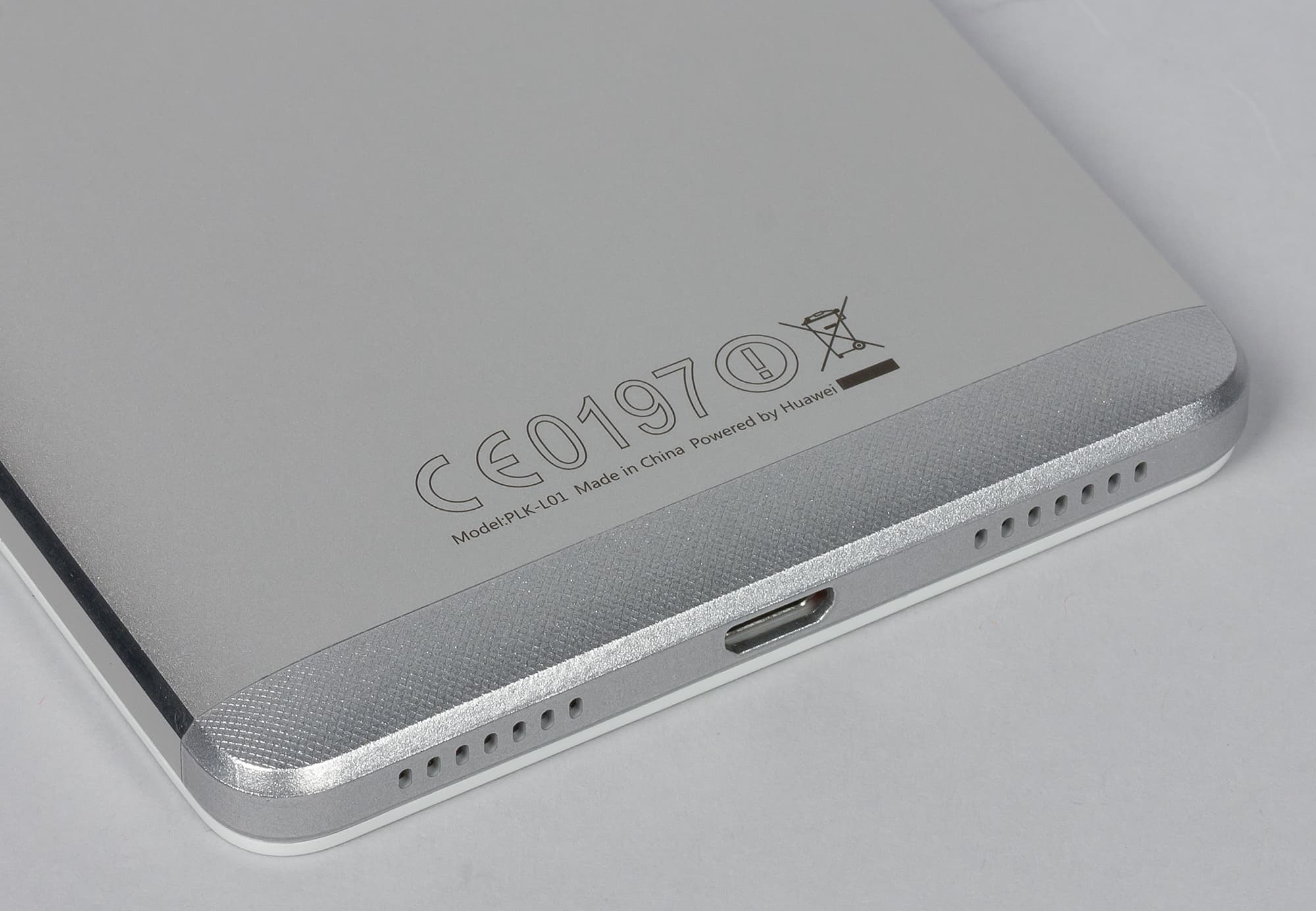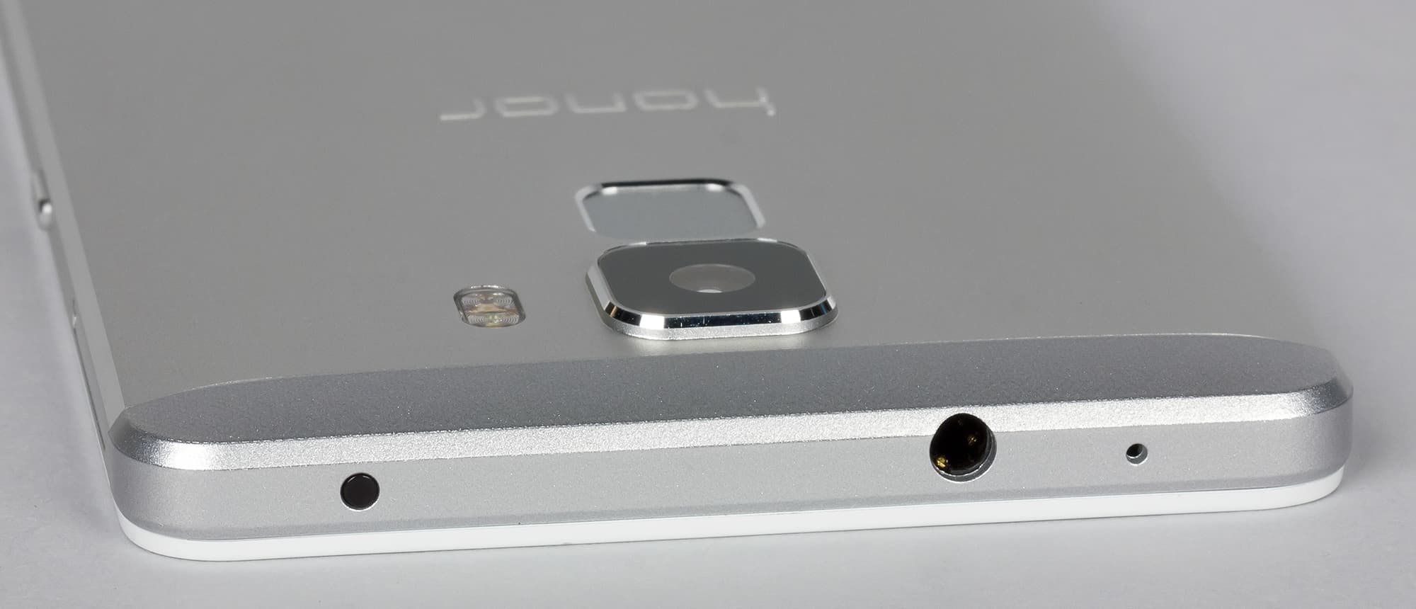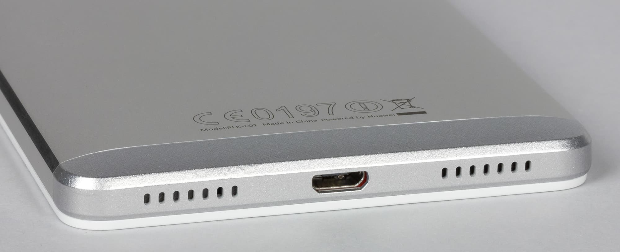 Основной динамик смартфона выведен в нижний торец. Как и у флагманского Mate S, здесь прямо в пластмассе вырезано два симметричных массива мелких продолговатых отверстий, но в отличие от металлического красивого «радиатора» Mate S, в пластике все это выглядит не столь внушительно. Естественно, звук на самом деле выходит лишь через одну из решеток, а вторая служит лишь для украшения (или за ней скрывается разговорный микрофон).