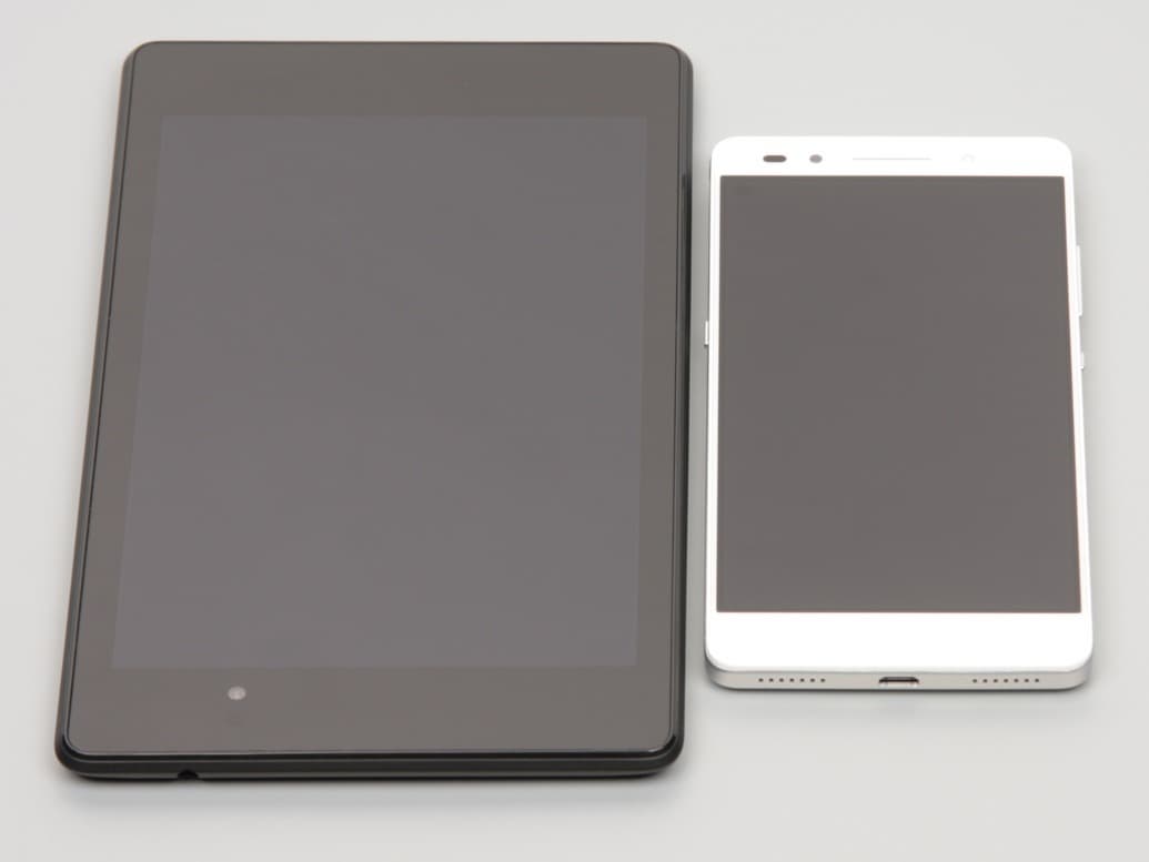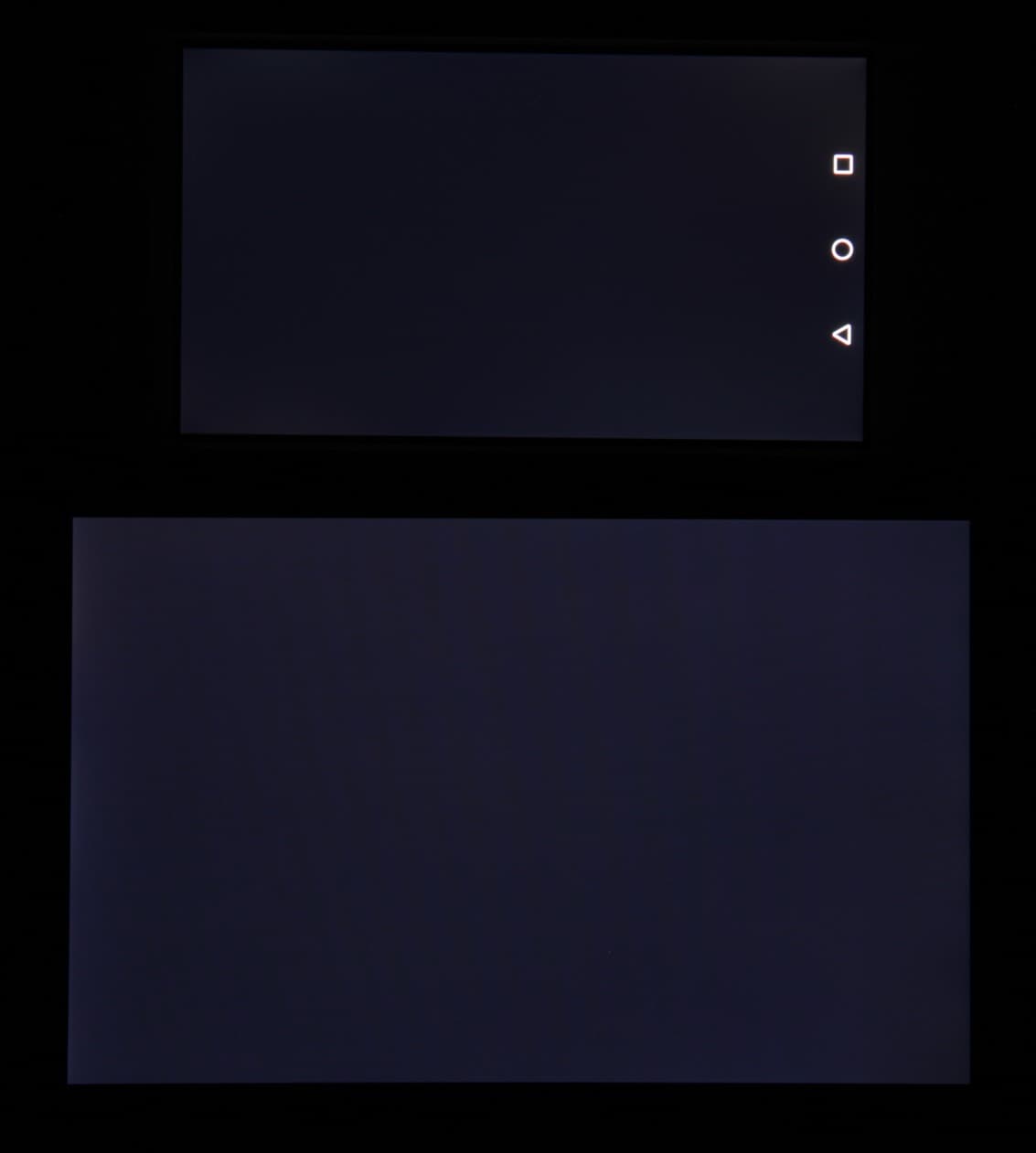 Лицевая поверхность экрана выполнена в виде стеклянной пластины с зеркально-гладкой поверхностью, устойчивой к появлению царапин. Судя по отражению объектов антибликовые свойства экрана не хуже, чем у экрана Google Nexus 7 (2013) (далее просто Nexus 7). Для наглядности приведем фотографию, на которой в выключенных экранах отражается белая поверхность (слева — Nexus 7, справа — Huawei Honor 7, далее их можно различать по размеру):