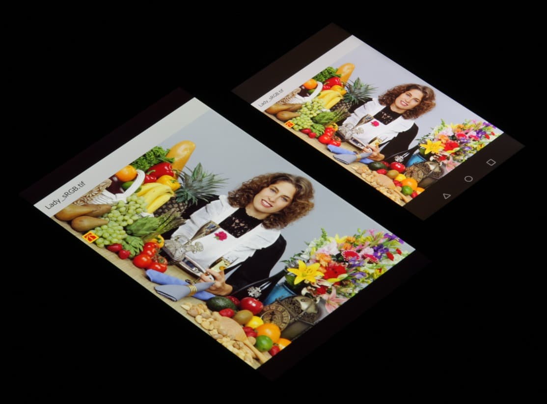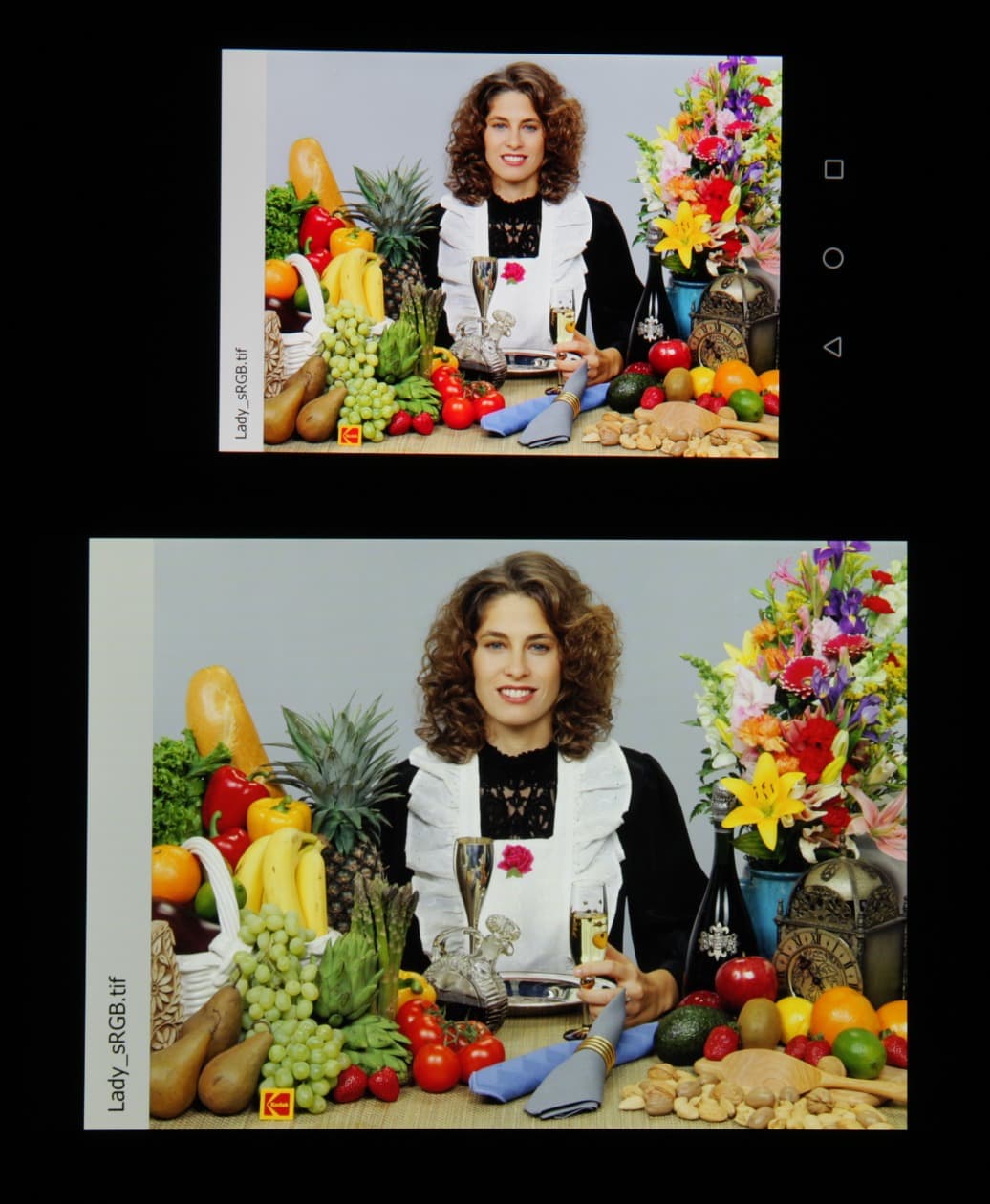Они нетипичные, но их мы уже видели в случае, например, Sony Xperia Z2. Sony указывает, что в этих экранах используются светодиоды с синим излучателем и зеленым и красным люминофором (обычно — синий излучатель и желтый люминофор), что в сочетании со специальными светофильтрами матрицы и позволяет получить широкий цветовой охват. Скорее всего, данное утверждение верно и в случае Huawei Honor 7. Для потребительского устройства широкий цветовой охват является никак не достоинством, а существенным недостатком, так как в итоге цвета изображений — рисунков, фотографий и фильмов, — ориентированных на пространство sRGB (а таких подавляющее большинство), имеют неестественную насыщенность. Особенно это заметно на узнаваемых оттенках, например на оттенках кожи. Результат приведен на фотографии выше.
