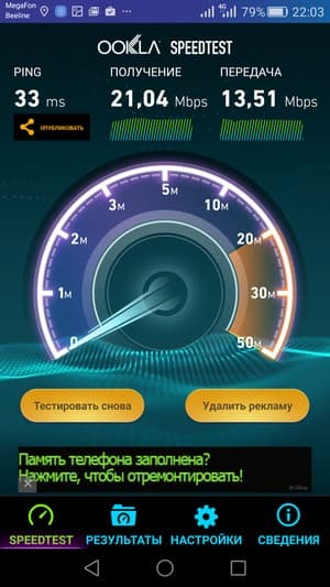 Поддерживается шесть диапазонов FDD LTE, при этом в трех наиболее распространенных у отечественных операторов диапазонах (B3, B7 и B20) герой обзора будет функционировать. На практике с SIM-картами операторов Билайн и МТС в московском регионе смартфон уверенно регистрировался и работал в сетях 4G. Качество приема сигнала нареканий не вызывает, аппарат уверенно поддерживает связь в помещениях и не теряет сигнал в зонах неуверенного приема.