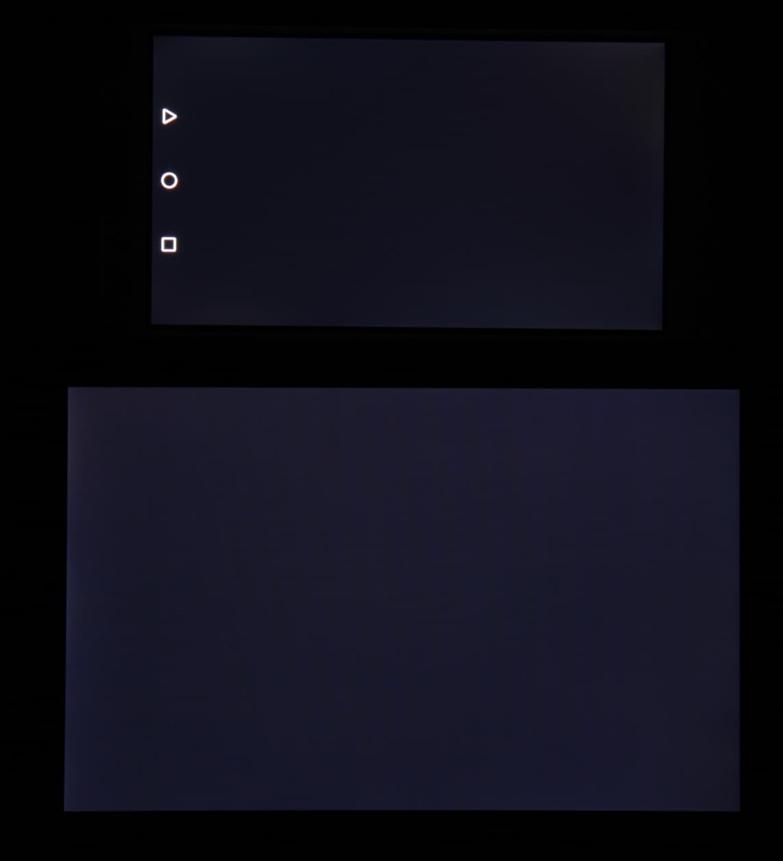 Яркость под углом у экранов уменьшилась (как минимум в 5 раз, исходя из разницы в выдержке), но у Huawei Honor 7 экран все же светлее (яркость по фотографиям 237 против 234 у Nexus 7). Черное поле при отклонении по диагонали высветляется сильно и приобретает красноватый оттенок. Фотографии ниже это демонстрируют (яркость белых участков в перпендикулярном плоскости экранов направлении одинаковая!):