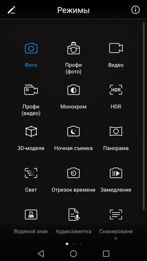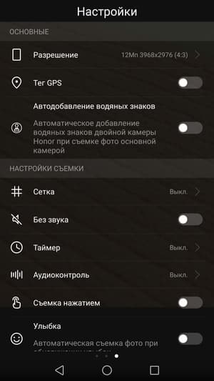 Меню, как обычно, имеет подробные ручные настройки для фото- и видеосъемки (выдержка (от 1/4000 до 30 с), светочувствительность (до ISO 3200), экспокоррекция, баланс белого, а также варианты фокусировки). В смартфонах Huawei всегда максимальное количество сюжетных режимов, вплоть до отдельных творческих режимов для съемки света или еды. Выделен режим HDR, а также есть монохромный режим, поскольку нужно было использовать тот факт, что в смартфоне установлена отдельная черно-белая камера. Есть возможность сохранять снимки в RAW (DNG).
