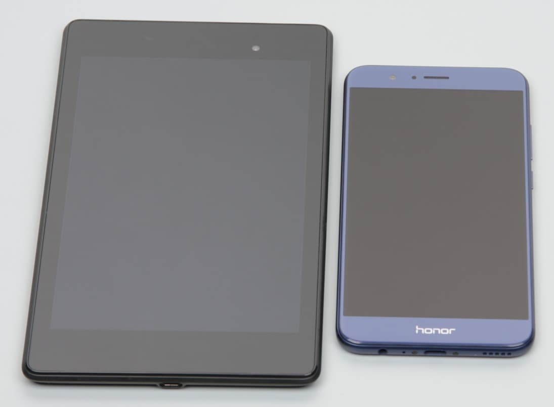 Лицевая поверхность экрана выполнена в виде стеклянной пластины с зеркально-гладкой поверхностью, устойчивой к появлению царапин. Судя по отражению объектов антибликовые свойства экрана лучше, чем у экрана Google Nexus 7 (2013) (далее просто Nexus 7). Для наглядности приведем фотографию, на которой в выключенных экранах отражается белая поверхность (слева — Nexus 7, справа — Honor 8 Pro, далее их можно различать по размеру):