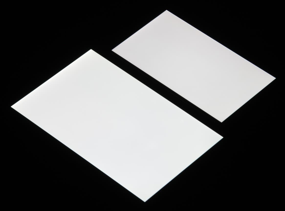 Яркость под углом у экранов уменьшилась (как минимум в 5 раз, исходя из разницы в выдержке), но у Honor 8 Pro экран все же темнее. Черное поле при отклонении по диагонали высветляется сильно и приобретает красноватый оттенок. Фотографии ниже это демонстрируют (яркость белых участков в перпендикулярном плоскости экранов направлении одинаковая!):