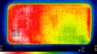 Нагрев больше в верхней правой части аппарата, что, видимо, соответствует расположению микросхемы SoC. По данным теплокамеры, максимальный нагрев составил 37 градусов (при температуре окружающего воздуха в 24 градуса), это не очень много.