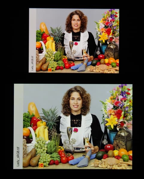 Спектры компонент хорошо разделены, что и обуславливает широкий цветовой охват. Для потребительского устройства широкий цветовой охват является никак не достоинством, а недостатком, поскольку в итоге цвета изображений — рисунков, фотографий и фильмов, — ориентированных на пространство sRGB (а таких подавляющее большинство), имеют неестественную насыщенность. Особенно это заметно на узнаваемых оттенках, например на оттенках кожи. Результат приведен на фотографии выше.