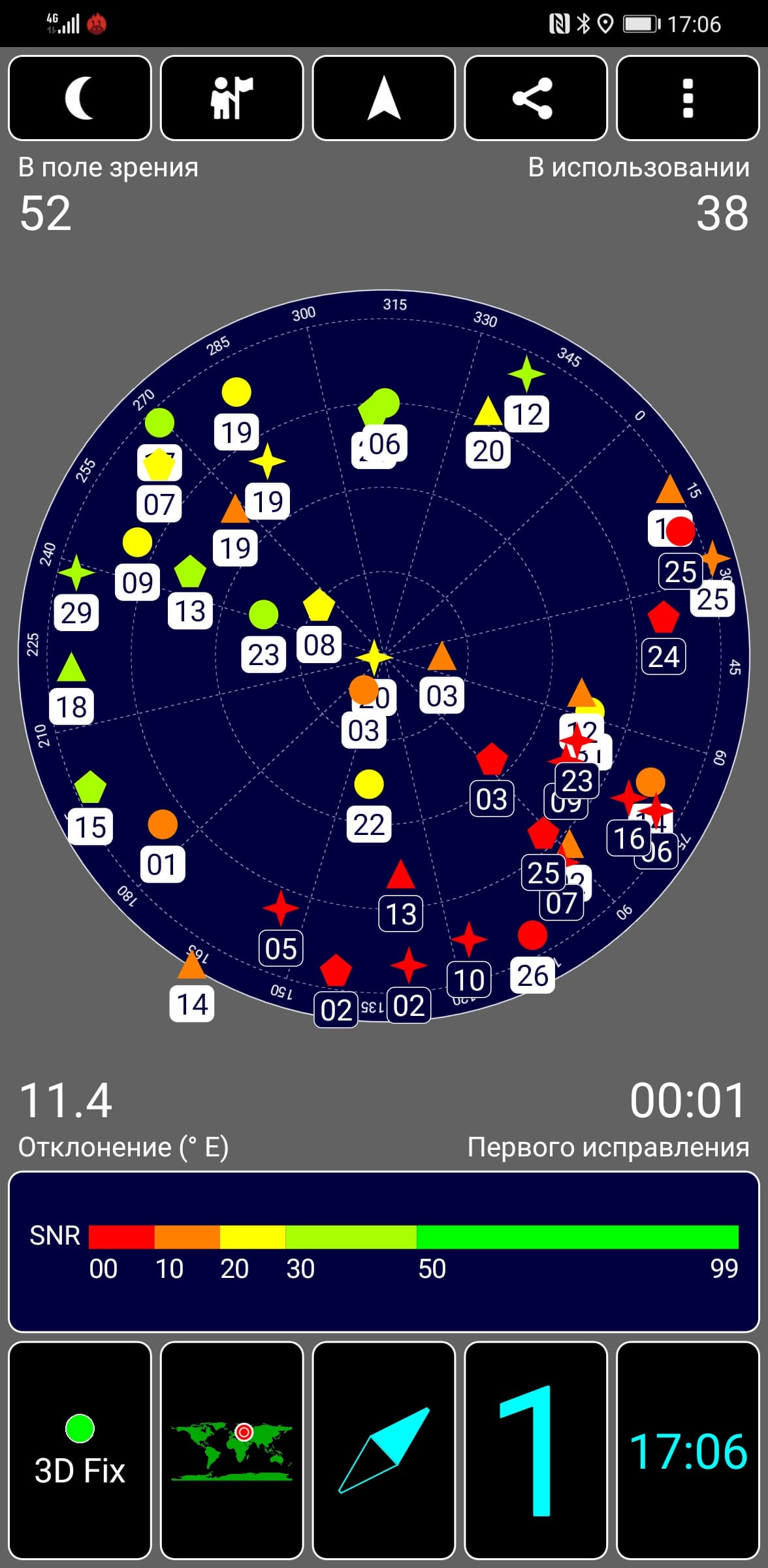 Навигационный модуль работает с GPS (двухчастотный, с A-GPS), с отечественной Глонасс, с китайской Beidou и с европейской Galileo. Первые спутники при холодном старте обнаруживаются быстро, в течение первых же секунд, точность позиционирования не вызывает претензий. Магнитный компас, необходимый для навигационных программ, на месте.