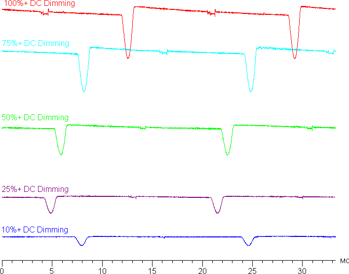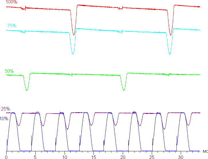 Только на низком уровне яркости появляется значимая модуляция с частотой 240 Гц. На рисунке ниже приведены зависимости яркости (вертикальная ось) от времени (горизонтальная ось) для нескольких значений настройки яркости: