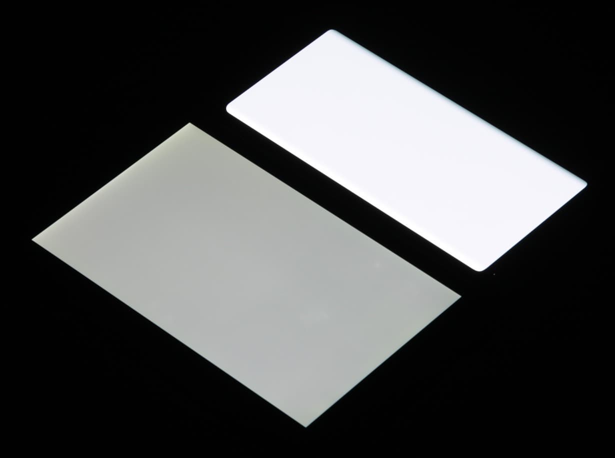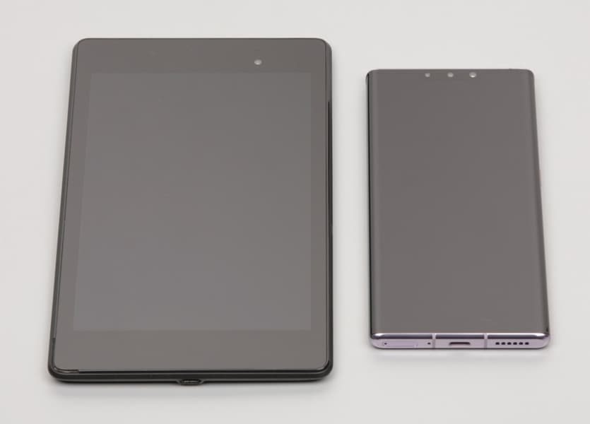 Лицевая поверхность экрана выполнена в виде стеклянной пластины с зеркально-гладкой поверхностью, устойчивой к появлению царапин. Судя по отражению объектов, антибликовые свойства экрана не хуже, чем у экрана Google Nexus 7 (2013) (далее просто Nexus 7). Для наглядности приведем фотографию, на которой в выключенных экранах отражается белая поверхность (слева — Nexus 7, справа — Huawei Mate 30 Pro, далее их можно различать по размеру):