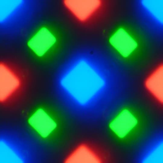 В этом экране используется матрица AMOLED — активная матрица на органических светодиодах. Полноцветное изображение создается с помощью субпикселей трех цветов — красного (R), зеленого (G) и синего (B), но красных и синих субпикселей в два раза меньше, что можно обозначить как RGBG. Это подтверждается фрагментом микрофотографии:
