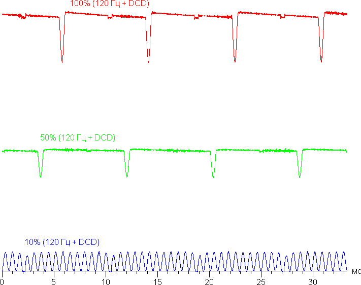 В англоязычной литературе и в новостях обычно используют название DC Dimming (на графиках сократим до DCD). Впрочем, при включении этой функции принципиальных изменений нет. В итоге на заметности мерцания это не сказывается — его по-прежнему не видно. Режим с частотой обновления 60 Гц: