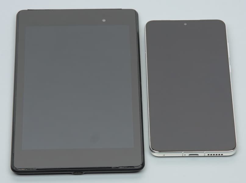 Лицевая поверхность экрана выполнена в виде стеклянной пластины с зеркально-гладкой поверхностью, устойчивой к появлению царапин. Судя по отражению объектов, антибликовые свойства экрана лучше, чем у экрана Google Nexus 7 (2013) (далее просто Nexus 7). Для наглядности приведем фотографию, на которой в выключенных экранах отражается белая поверхность (слева — Nexus 7, справа — Huawei Mate 50, далее их можно различать по размеру):